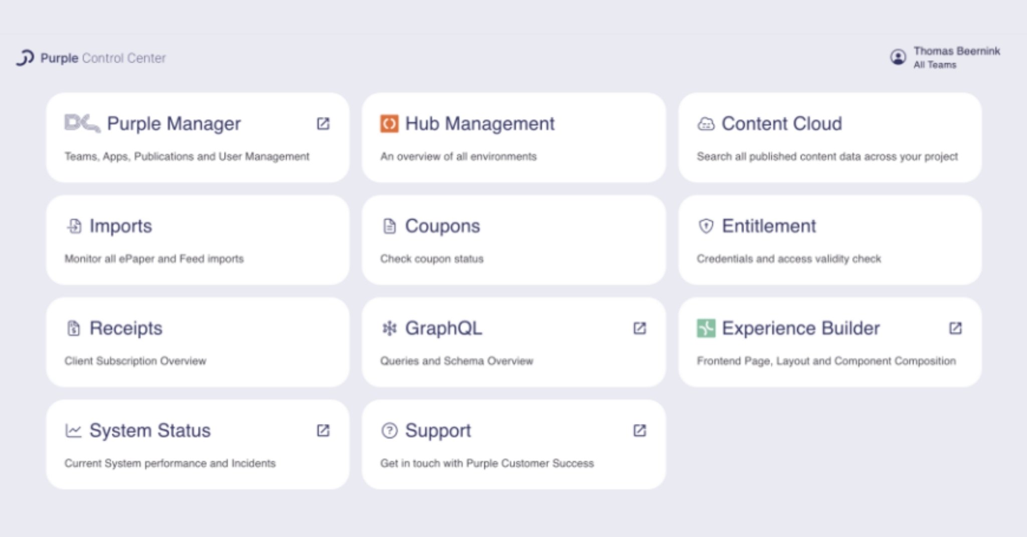 The new Purple Control Center consolidates all administrative tools in one place: app management, Content Cloud, imports, coupons, entitlement, system status. Previously, these tools were spread across different URLs. The Control Center is accessible with your existing Purple login credentials and is designed for administrators.