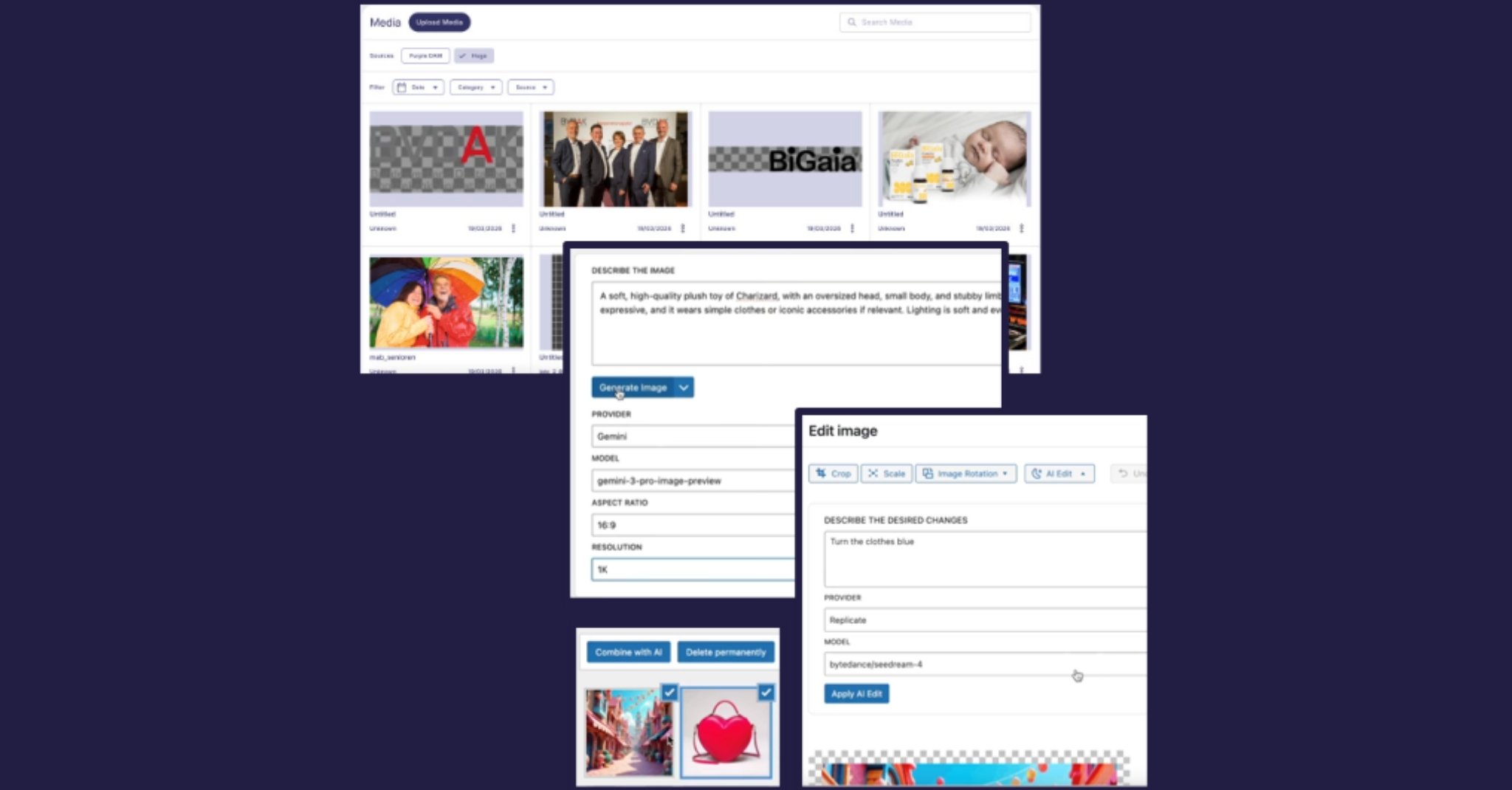 Purple DAM is our fundamentally redesigned media library. All media files are now displayed as clear cards, with improved navigation, multi-select functionality and full control over your media files. The DAM supports industry standards such as EXIF and IPTC data. All metadata is recognized and displayed directly upon upload.