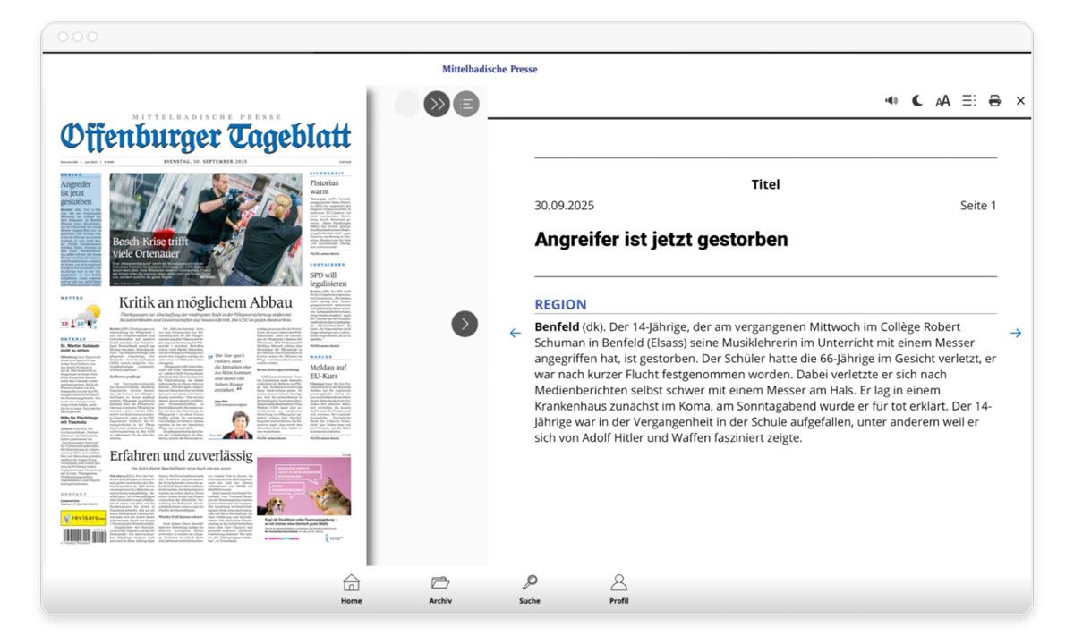 "The error rate has now been reduced to zero; everything functions reliably without our intervention", reports Richard Frisch, Marketing and Sales Director of Mittelbadische Presse, regarding the improvements. "The early evening edition, which had been defined as a must-have criterion, runs stably from 8 PM – this was not possible with the previously contracted provider. That was also a decisive reason for the switch. Advertising inserts and supplements are uploaded without issues via stable workflows and can be made available both free of charge and as individual purchases," Frisch adds.