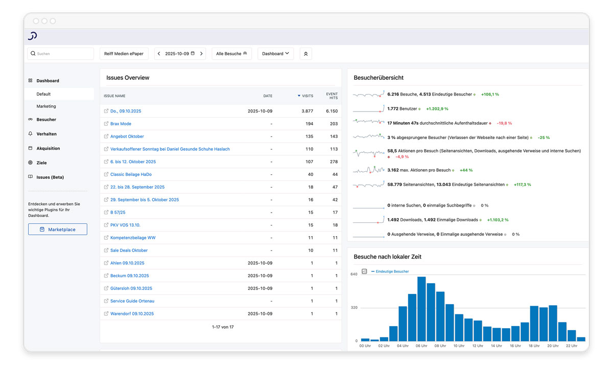 Another crucial piece of the puzzle is Purple's e-paper analytics solution with dedicated dashboards for the editorial and marketing teams. The tool enables reiff medien to conduct edition- and article-based analyses without consent banners and in full GDPR compliance. A feature that hardly any other analytics solution on the market offers. The edition overview shows the most visited pages and articles and allows real reader interests to be identified and specific focuses of individual departments to be planned accordingly.